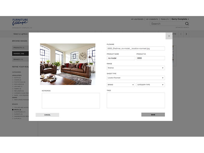 Over the years, the services we supply have evolved and increased. Most recently we have created a bespoke Digital Asset Management site to meet the growing needs of the client. The DAM site is an online hub where product images and room sets are uploaded and can be accessed to use for e-commerce, promotion and advertising requirements. Complete Ltd’s Post-Production team retouch and colour manage each product and all it’s aspects prior to adding to the site. The images can then be accessed by Furniture Village’s in-house press, sales and marketing departments. Complete Ltd designed & developed the custom-made DAM site, by identifying specific requirements to streamline operations between our Post-Production team and Furniture Village and their suppliers.